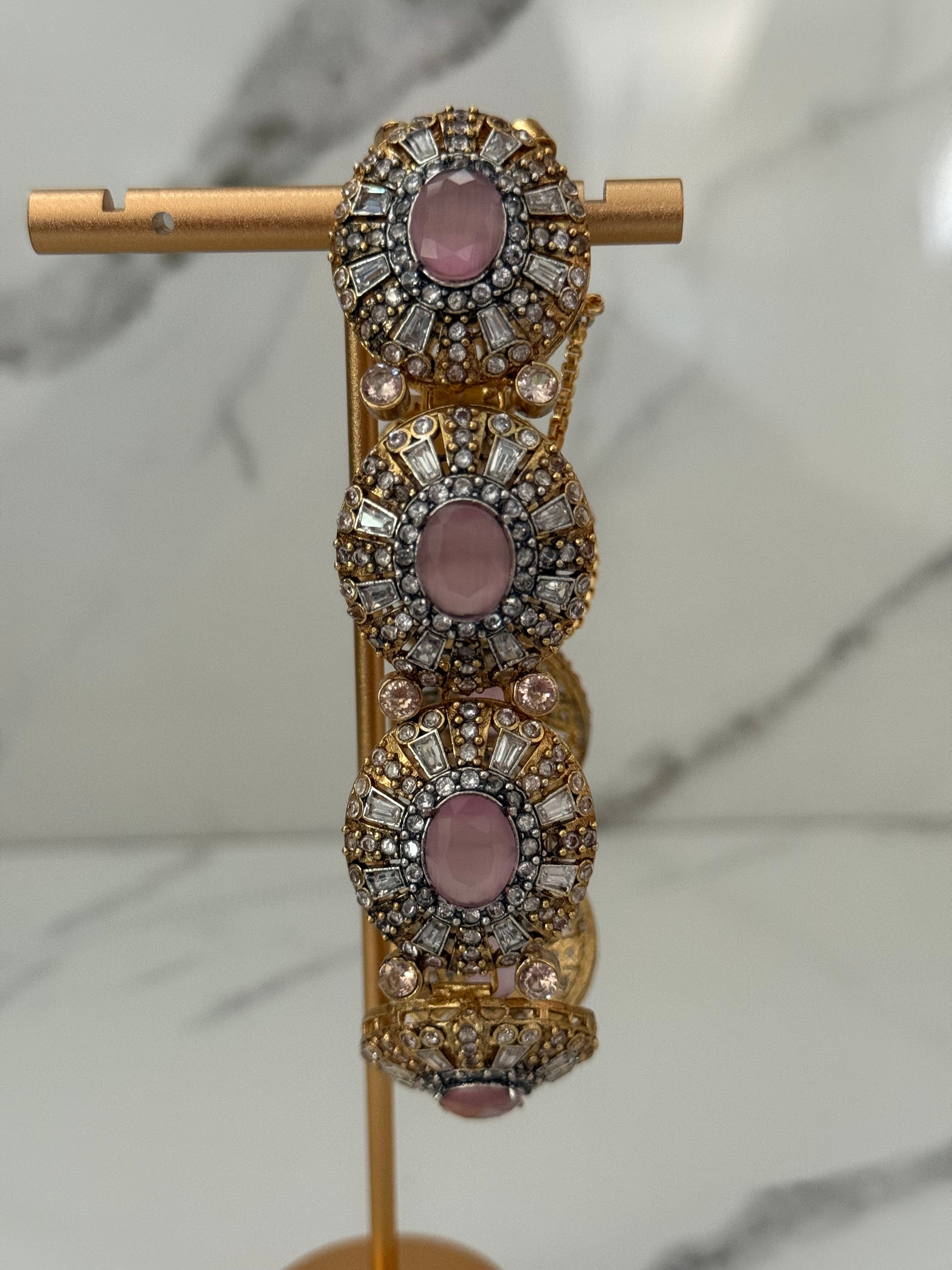 Add elegance to your look with this handcrafted Kundan-style bracelet, designed with sparkling stones, pearl accents, and intricate detailing. The timeless design makes it perfect for pairing with your choker sets or wearing as a statement piece on its own.